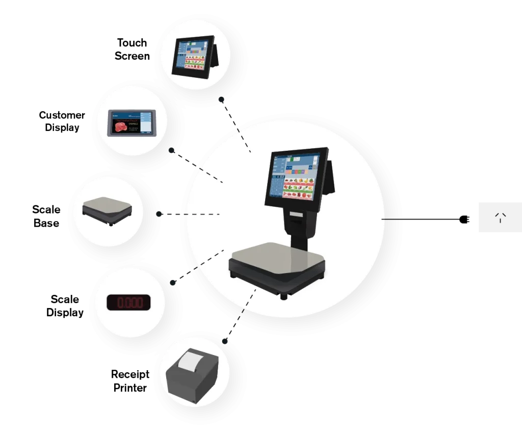 - Five-in-One Design: Combines a touch screen, customer display, scale base, scale display, and receipt printer into one seamless system